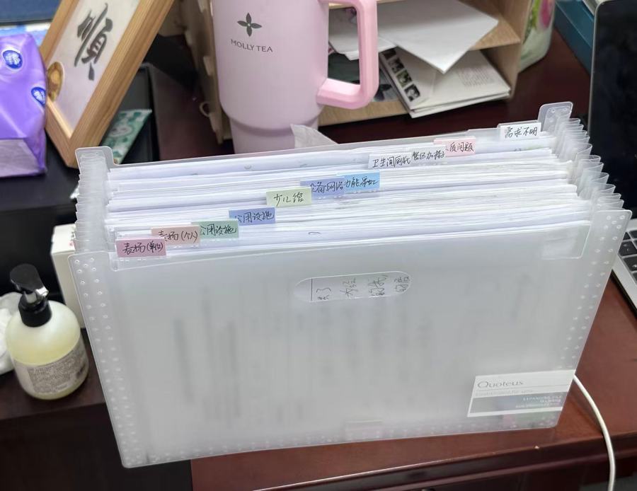一本留言簿写满后,读者的留言会按照几个大类归档,如“噪音问题”“茶水间水质问题”等,某个类别中的意见单页越积越厚,也意味着这个问题不容忽视。