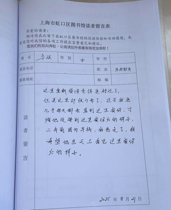 当她如愿考入虹口图书馆时,正好赶上了馆内留言簿的变革。有时徐诗觉得,这里每天发生的变化,好像都是被留言簿上的留言推着往前走的。
