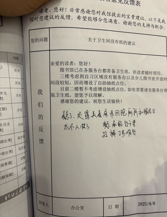 在这座庞大而现代的图书馆里,意见册像一套运行良好的工作流程,规范、冷静。在这里,图书馆是提供服务的机构,而非倾诉情感的树洞。