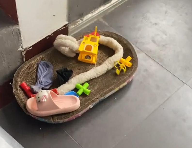 所以,每次捡东西回来,它都会把捡的东西放在猫窝里。